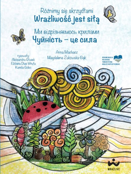 „Różnimy się skrzydłami. Wrażliwość jest siłą” to książka autorstwa Anny Machacz i Magdaleny Żukowskiej-Bąk, dedykowana dzieciom ukraińskim i polskim. Składa się z opowiadań, które oswajają lęki wojny, uczą akceptacji, tolerancji i pokazują, jak odnaleźć się w zupełnie nowym, obcym środowisku. Historie w sposób niebezpośredni obrazują sytuację w Ukrainie, ponieważ bohaterami są zwierzątka oraz owady, które mierzą się z trudnościami związanymi z przeprowadzką, stygmatyzacją społeczną, lękiem, samotnością. Książkę kierujemy do dzieci, które zamieszkały w Polsce, ale też do małych Polaków i Polek, ponieważ uważamy, że ów specyficzny lęk dotyk każde z nich. Opowiadania zostały stworzone przy pomocy psycholożki, by każde z nich miało mocny fundament psychologiczno-pedagogiczny. Są dedykowane nie tylko dzieciom oraz rodzicom, ale także nauczycielom. Każdy z rozdziałów został opatrzony „Słowem od psychologa” z zadaniami, które pomogą w integracji i wspólnym czytaniu.